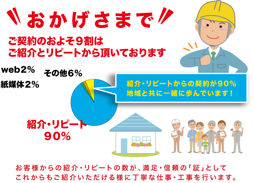 その間、地元密着で事業する上での基本として、一番心掛けてきた行動は『どんな小さな事でもキチンと対応させて頂く!』であり、顧客ニーズに応じて地域密着にて取り組んできました。 これまで携わってきた顧客の高齢化に伴い、住まいのお困りごと以外にも対応できるように「健康リフォーム」としてこれからの生活を見直すきっかけとなる、情報や事例などをお伝えしながら、健康食品や健康器具等の情報発信を行っています。 また、事務所兼ショールームにおいて、料理実演会を定期的に開催し、お客様のお困りごと相談や解決のお手伝いが出来る会社であり続けたいと思います。
